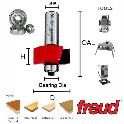 | Freud-32-526 | Rabbeting Router Bit Bearing Set 1-3/8" Dia x 3/4"H x 2-1/2"OAL x 1/2"Shk with Bearing Flush, 1/8", 1/4", 5/16", 3/8", 7/16", 1/2" | 1-3/8" | 3/4" | Flush, 1/8", 1/4", 5/16", 3/8", 7/16", 1/2" | 2-1/2" | 1/2" | 16000 | Call |