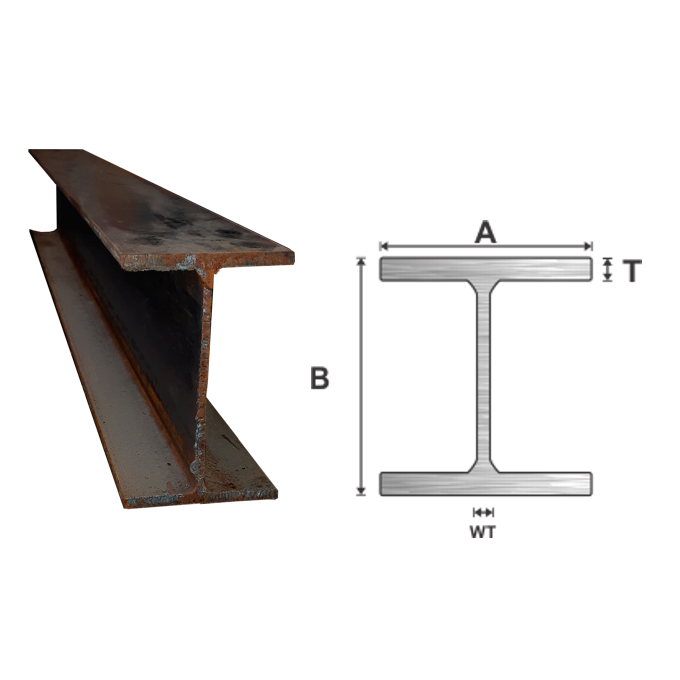 | Part No | Desc. | Metric | Flange Width (A) | Web Height (B) | Flange Thickness (T) | Web Thickness (WT) | Weight per/foot (lb) | Lgt | Avail.* |